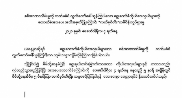 ဒီလို စစ်အာဏာသိမ်းမှုကို လက်မခံဘဲ လွှတ်တော်ခေါ်ယူခဲ့ကြတဲ့ ရွေးကောက်ခံကိုယ်စားလှယ်တွေကို ထောက်ခံအားပေးတဲ့ အနေနဲ့ လက်ခုပ်တီး ကမ်ပိန်းလှုပ်ရှားမှုတစ်ခု ဒီကနေ့ ဖေဖော်ဝါရီ (၄) ရက် ညနေ (၅) နာရီမှာ ပြုလုပ်မယ်ဆိုပြီး လူမှုကွန်ယက်စာမျက်နှာမှာ ပျံ့နှံ့နေပါတယ်။